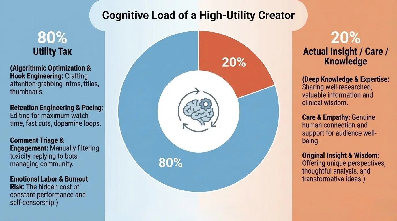 To exist in the public digital space today, it’s no longer enough to be accurate, useful, or humane—you must be performant. Mission-driven creators are forced to pay what I call the Utility Tax: the additional emotional and cognitive labor required to compress nuance, care, and truth into a format that satisfies systems optimized for the most reactive layers of the human nervous system (friction, outrage, comparison, retention loops).